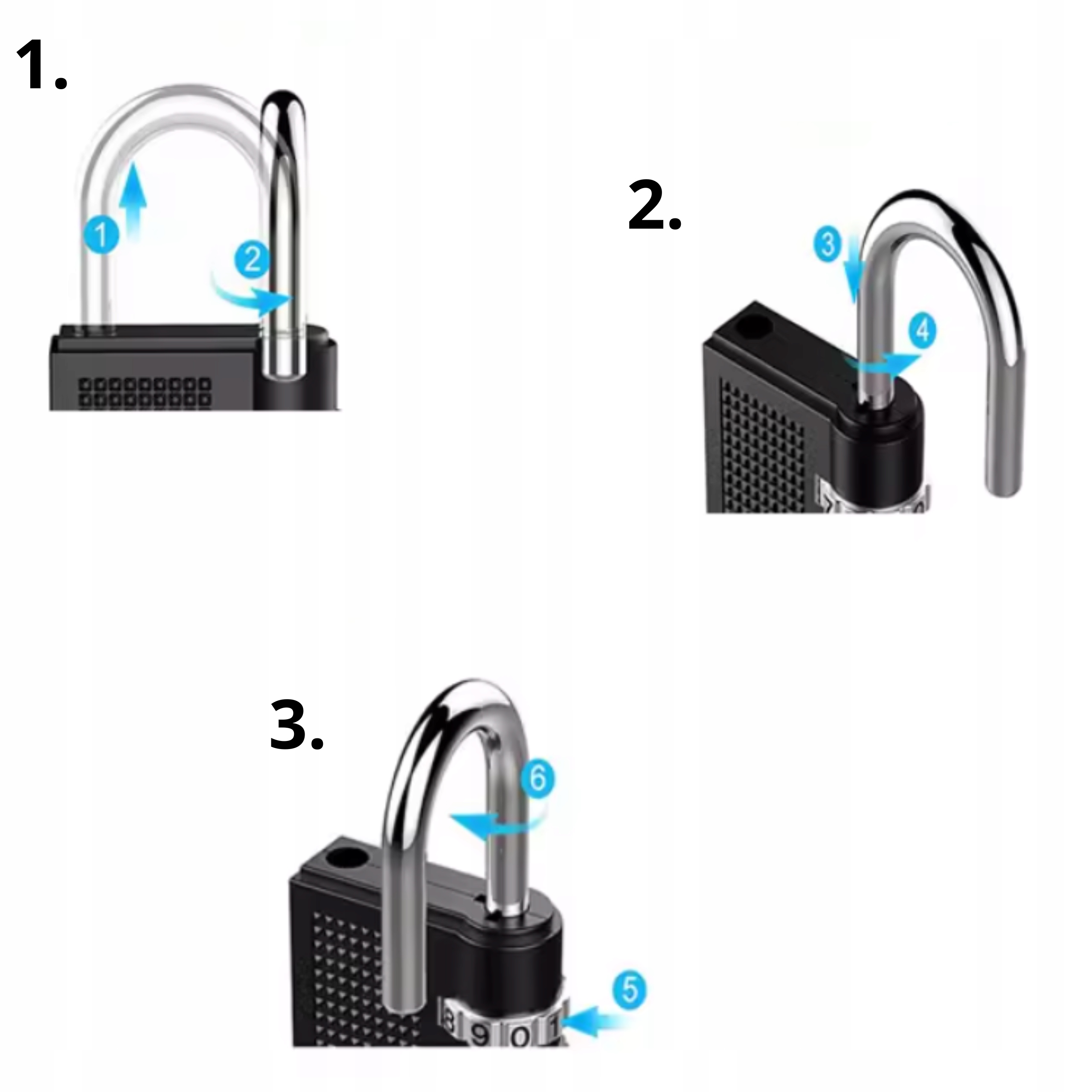 - Aby kłódka była zamknięta, wciskamy zapięcie i przestawiamy cyfry na losowe.
